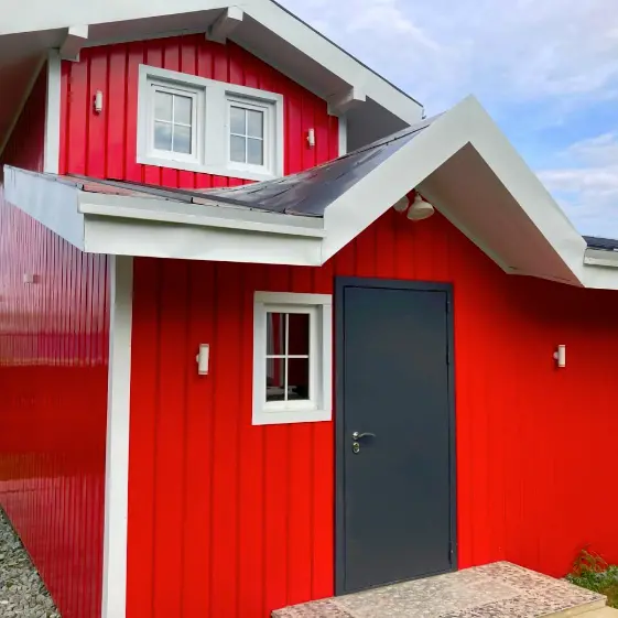 Яркий, смелый, неподвластный времени — фасад с вертикальным монтажом металлического сайдинга ЕвроБрус под брус в насыщенном красном оттенке RAL 3020 моментально превращает дом в архитектурный акцент, который невозможно не заметить. Такой выбор не только подчеркивает статус и индивидуальность хозяев, но и гарантирует долговечность, защиту от внешних факторов и идеальный внешний вид на долгие годы. Это не просто облицовка — это инвестиция в стиль, престиж и комфорт вашей жизни!